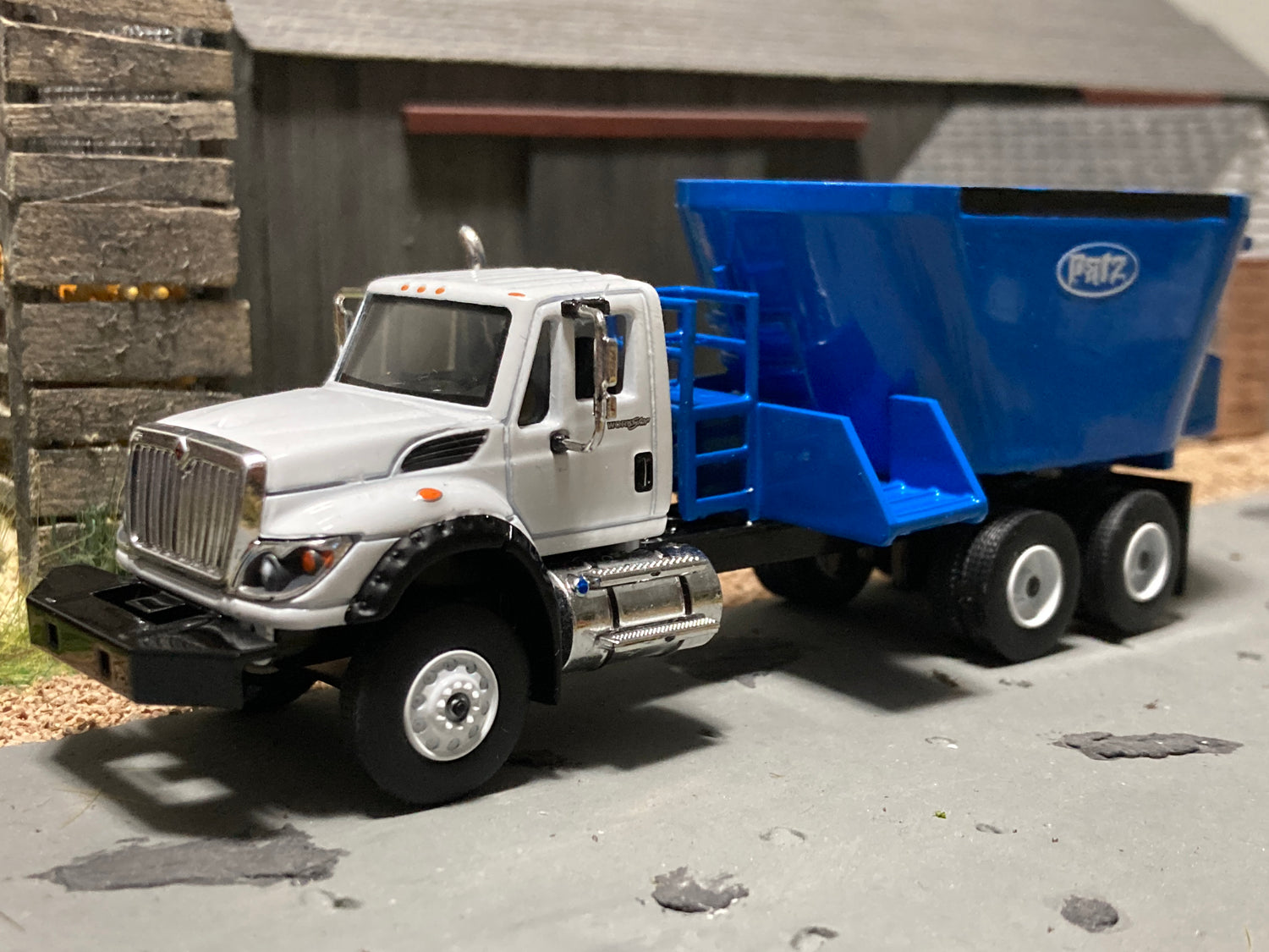 1/64 Vertical Feed Twin Screw Blue on White International Workstar Truck